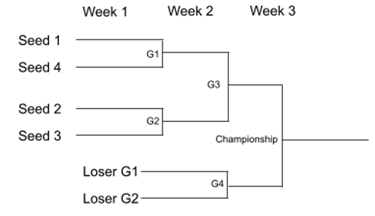 Playoffs are a seeded bracket with one opportunity to claw back from a first-game loss. A loss after your first game is an elimination: